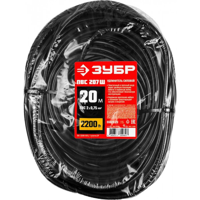 Удлинитель-шнур силовой ПВС 2 x 0.75 мм2 20 м 2200 Вт ЗУБР ПВС-207-Ш 55023-20