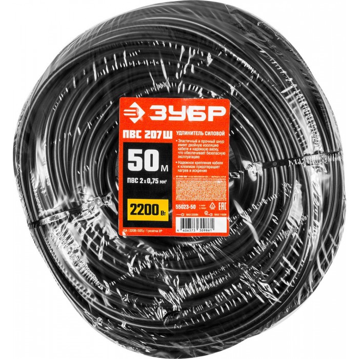 Удлинитель-шнур силовой ПВС 2 x 0.75 мм2 50 м 2200 Вт ЗУБР ПВС-207-Ш 55023-50