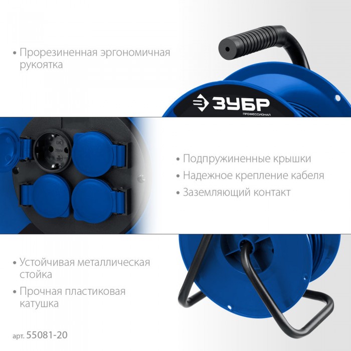 • Катушка позволяет легко сматывать и разматывать кабель, обеспечивая мобильное перемещение и компактное хранение.