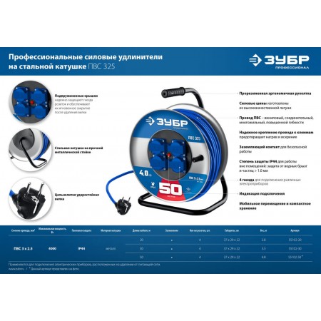 - Для безопасного и легкого перемещения силового удлинителя ЗУБР по рабочей площадке предусмотрена прорезиненная эргономичная рукоятка
