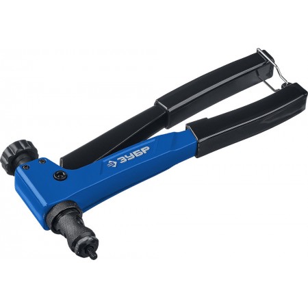 Применяется для установки стальных и алюминиевых резьбовых заклепок. Способ применения 1. Разожмите рукоятки и установите насадку и резьбовой стержень требуемого диаметра. Для замены резьбового стержня необходимо вытолкнуть штифт через боковое отверстие в головке. 2. Накрутите заклепку на стержень до упора, рукоятки при этом должны быть полностью разжаты. При необходимости ослабьте гайку и отрегулируйте ход вращением корпуса головки. 3. Вставьте заклепку в отверстие и сожмите рукоятки. 4. Выкрутите стержень из заклепки, вращая рукоять против часовой стрелки. Заклепка установлена, когда образовался бортик. Дальнейшее вытягивание приводит к поломке насадок.