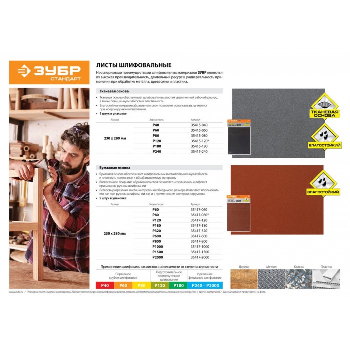 Неоспоримыми преимуществами шлифовальных материалов ЗУБР является их высокая производительность, длительный ресурс и универсальность применения при обработке металла, древесины и пластика.