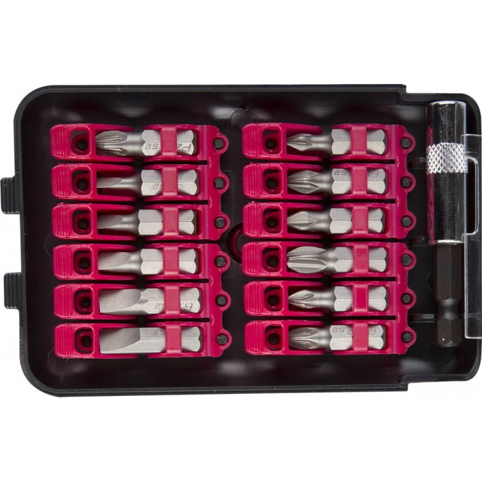 Запатентованная система крепления бит позволяет легко извлекать необходимую биту из коробки. При этом остальные биты остаются на своих местах.