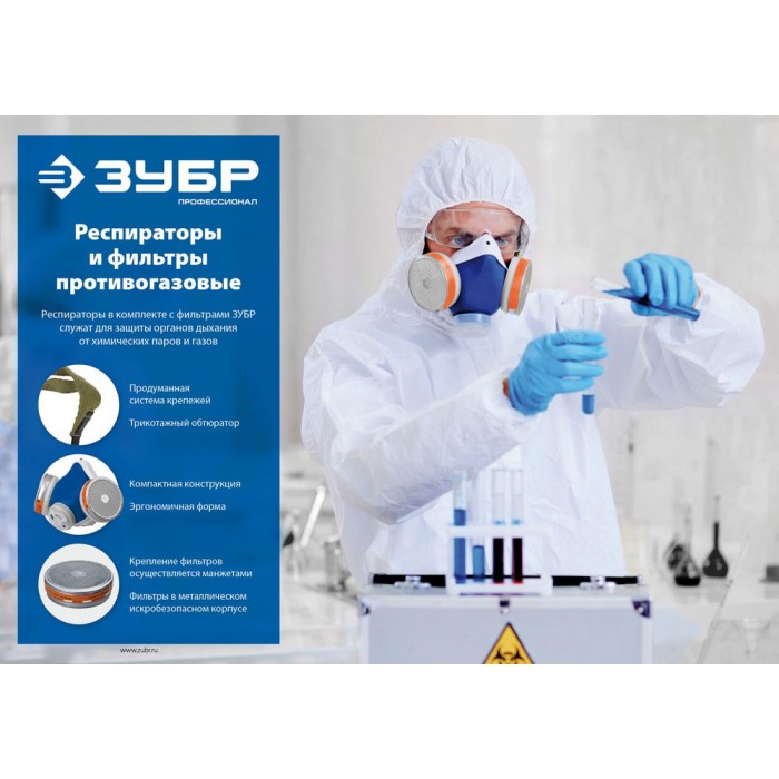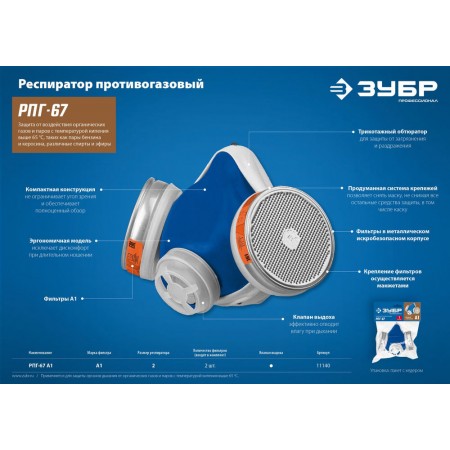 В комплекте с противогазовыми фильтрами марки ″А1″ служит для защиты от органических газов и паров с температурой кипения выше 65оС. Рекомендуется использовать с фильтрами ЗУБР арт. 11141_z02 (A1)