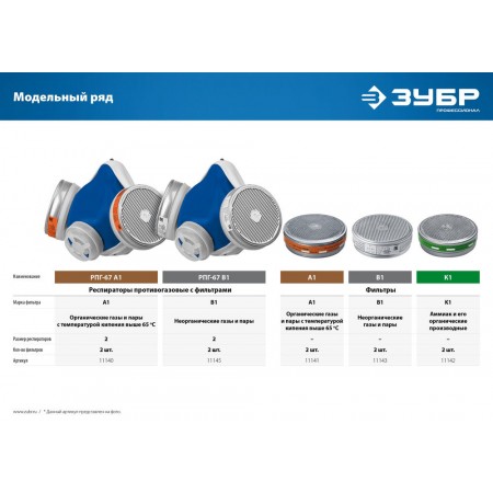 Полумаски (респираторы) ЗУБР в комплекте с противогазовыми фильтрами марки ″А1″ служит для защиты от органических газов и паров с температурой кипения выше 65оС. Рекомендуется использовать с фильтрами ЗУБР арт. 11141_z02 (A1)