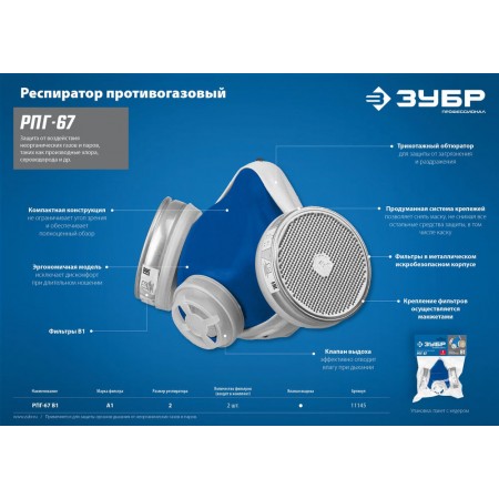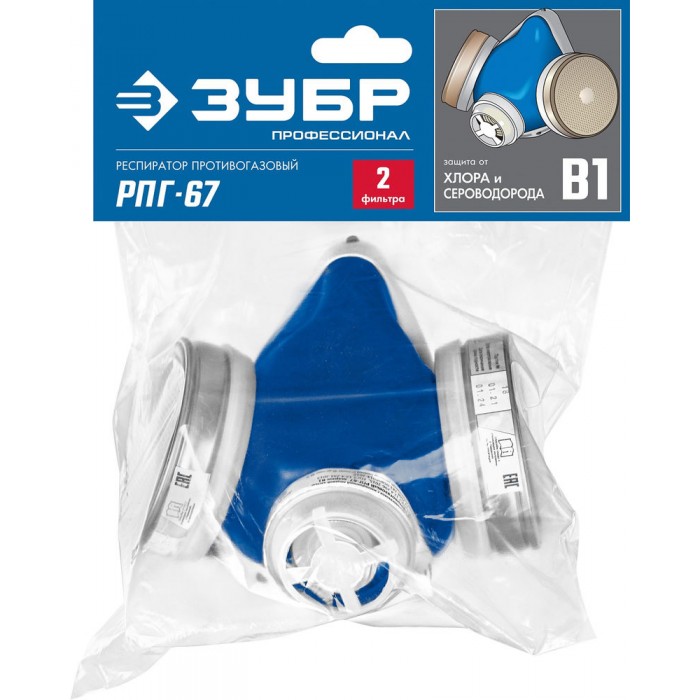 В комплекте с противогазовыми фильтрами марки ″B1″ служит для защиты от неорганических производных - хлора, сероводорода и др. Рекомендуется использовать с фильтрами ЗУБР арт. 11143 (B1)