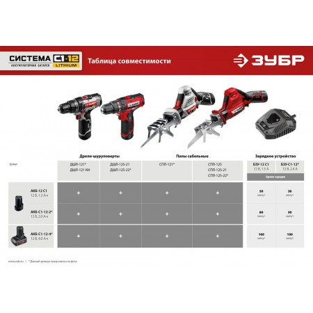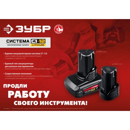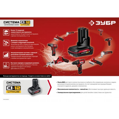 Литий-ионная технология ЗУБР нового поколения: - увеличение производительности на 35%, - электронная система защиты от перегрузки, перегрева и глубокой разрядки, - отсутствие эффекта памяти, - отсутствие потери мощности в процессе работы