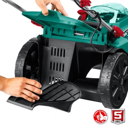 - Облегченные колеса и эргономичная рукоятка облегчают перемещение косилки по газону
