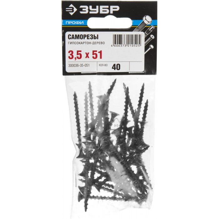 Саморез гипсокартон-дерево фосфатированный 51 х 3.5 мм, 40 шт Профессионал СГД ЗУБР 300036-35-051