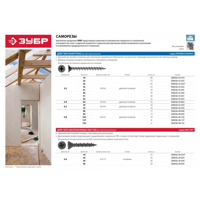 • Резьба с редким шагом разработана для крепления гипсокартона к деревянной обрешетке без крошения волокнистой структуры дерева.