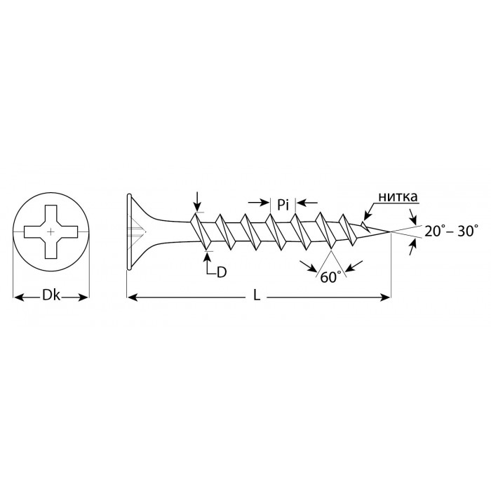 • Резьба с редким шагом разработана для крепления гипсокартона к деревянной обрешетке без крошения волокнистой структуры дерева.