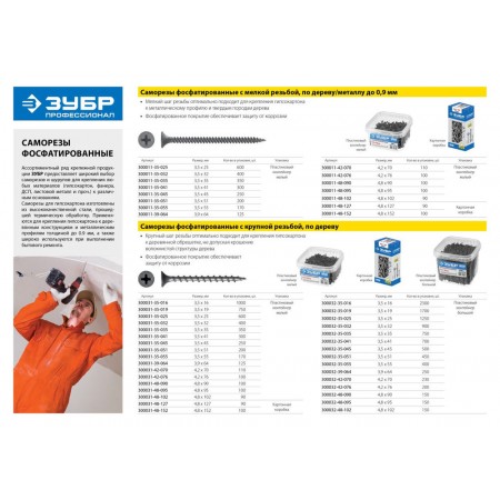Саморез гипсокартон-металл фосфатированный 90 х 4.8 мм, 250 шт Профессионал СГМ ЗУБР 300015-48-090