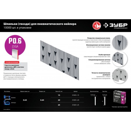 Шпильки для нейлера тип P0.6 15 мм, калибр 23GA, 10 000 шт ЗУБР Профессионал 31835-15