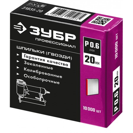 Шпильки для neйлера тип P0.6 20 мм, калибр 23GA, 10 000 шт ЗУБР Профессионал 31835-20