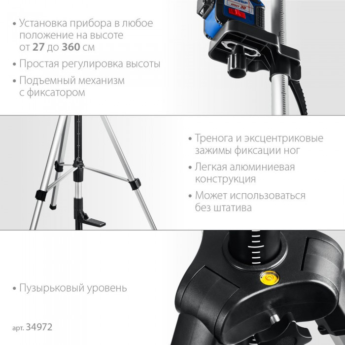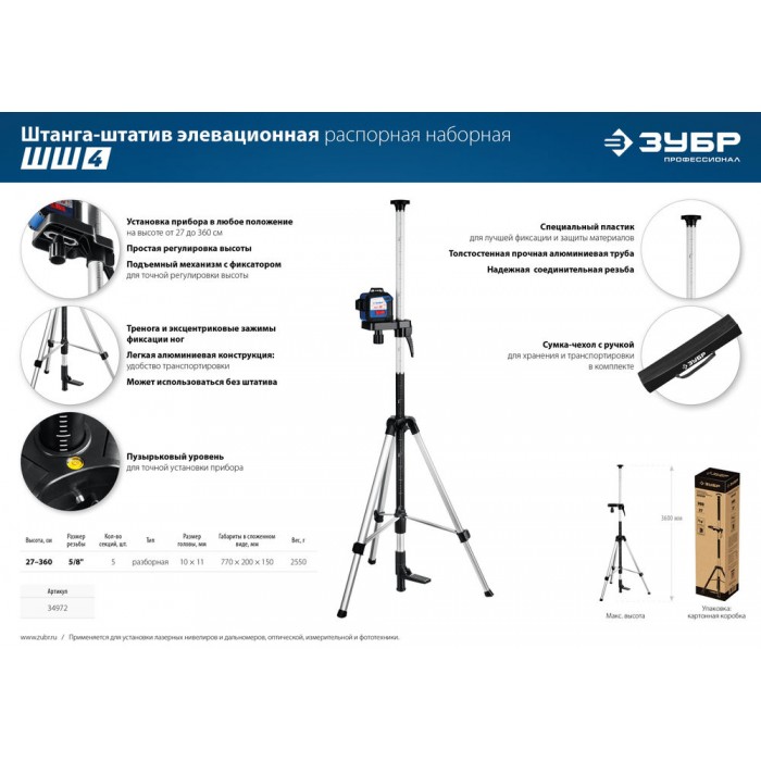 Профессиональный инструмент для работы с лазерным, оптическим и фотоинструментом, там где требуется разметка на большой высоте. Выполнена из алюминиевого сплава, благодаря чему имеет небольшой вес. А за счёт разборной конструкции штангу легко носить и легко с ней работать.