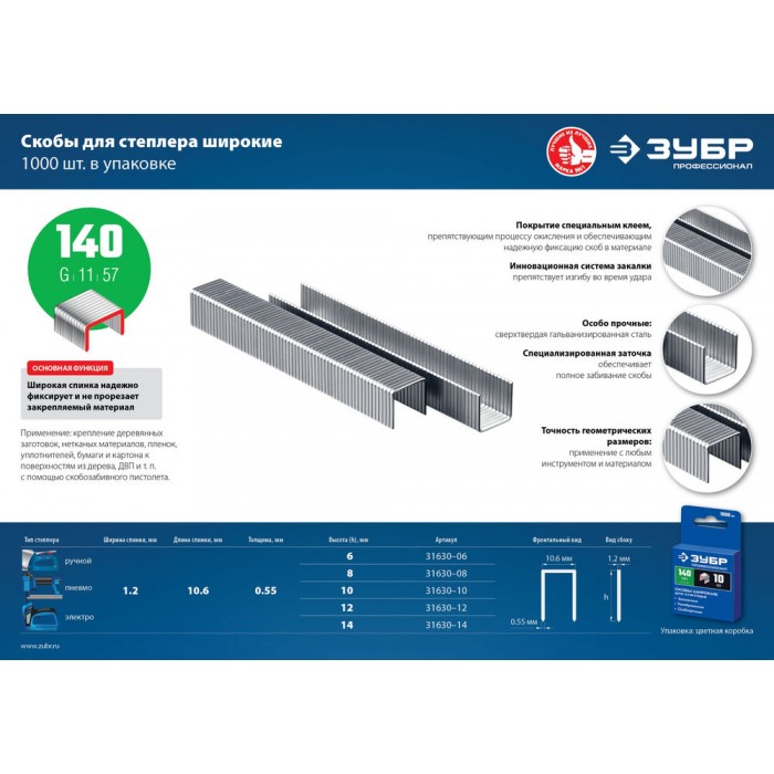 Скобы 14 мм, тип 140 (G/11/57), калибр 20GA, 1000 шт Профессионал ЗУБР 31630-14_z01