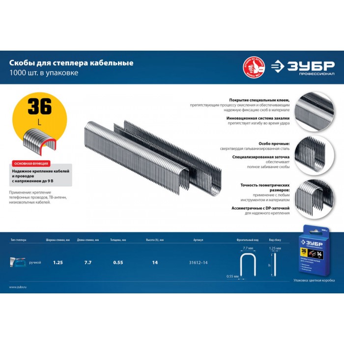 Скобы 14 мм, тип 36 (L), калибр 20GA, 1000 шт Профессионал ЗУБР 31612-14_z01