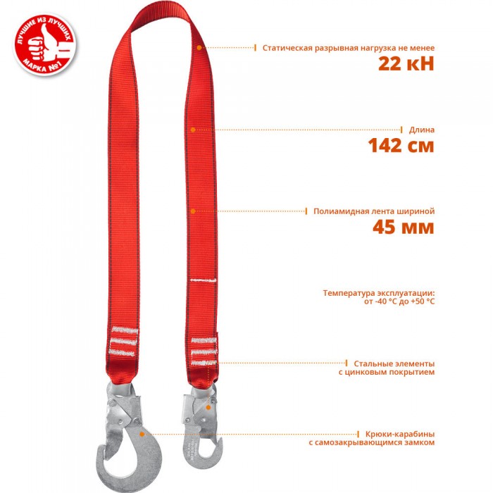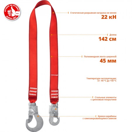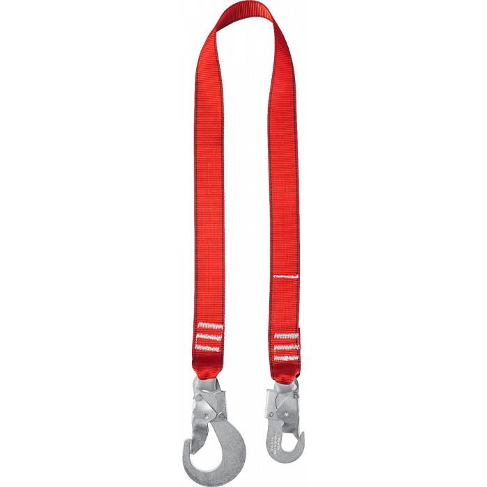 Строп, в сочетании со страховочным поясом или привязью, служит для остановки падения человека при работе на высоте.