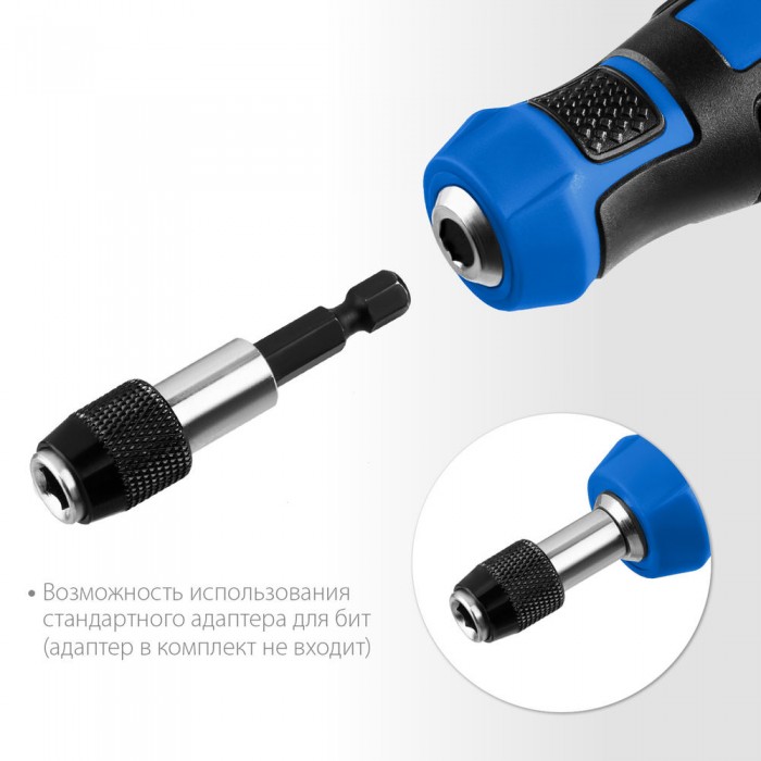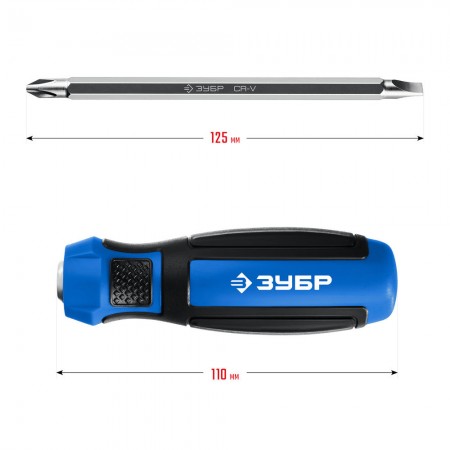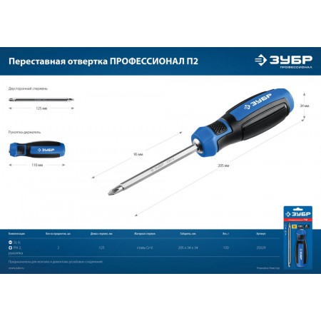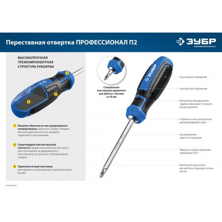 Отвертка с переставным стержнем выдерживает высокие нагрузки, благодаря высокой твердости наконечника и специальной закалке. Комфортная рукоятка обеспечивает твердый хват и удобство работы.