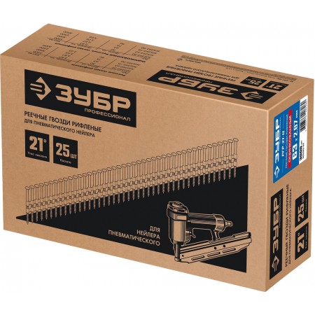 Для сборки деревянных конструкций, крепления тонколистового металла до 0.9 мм. Монтаж производится при помощи гвоздезабивного пистолета (нейлера) ЗУБР П21-90 (арт. 31931) или аналогичного, рассчитанного на работу с гвоздями в кассетах с углом наклона 21 град.
