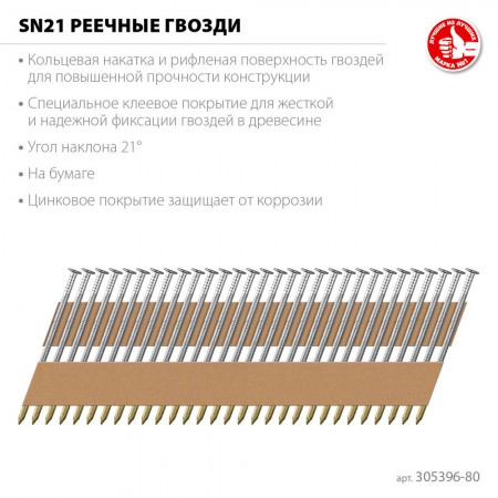 Реечные гвозди соединены в кассету под углом 21° и забиваются при помощи гвоздезабивного пистолета (нейлера). Рифленая поверхность гвоздей оптимально подходит для монтажа деревянных конструкций. Использование нейлера обеспечивает высокую скорость монтажа и удобство в работе.