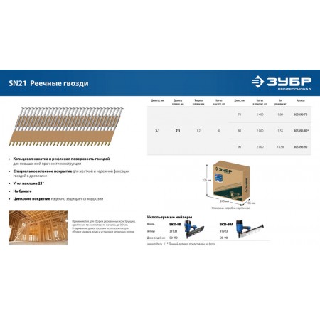 Для сборки деревянных конструкций, крепления тонколистового металла до 0.9 мм. В каркасном домостроении используются для сборки каркаса дома и установки черновых полов. Монтаж производится при помощи гвоздезабивного пистолета (нейлера) ЗУБР SN21-90 (арт. 31931), ЗУБР SN21-90A (арт. 31923) или аналогичного, рассчитанного на работу с гвоздями в кассетах с углом наклона 21 град. Во избежание повреждения кассеты на бумажной основе при установке в магазин нейлера не допускайте сильных ударов толкателя по кассете с гвоздями.