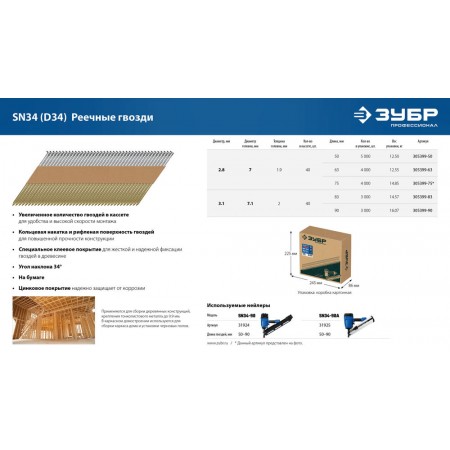 Для сборки деревянных конструкций, крепления тонколистового металла до 0.9 мм. В каркасном домостроении используются для сборки каркаса дома и установки черновых полов. Монтаж производится при помощи гвоздезабивного пистолета (нейлера) ЗУБР SN34-90 (арт. 31924), ЗУБР SN34-90A (арт. 31925) или аналогичного, рассчитанного на работу с гвоздями в кассетах с углом наклона 34 град. Во избежание повреждения кассеты на бумажной основе при установке в магазин нейлера не допускайте сильных ударов толкателя по кассете с гвоздями.
