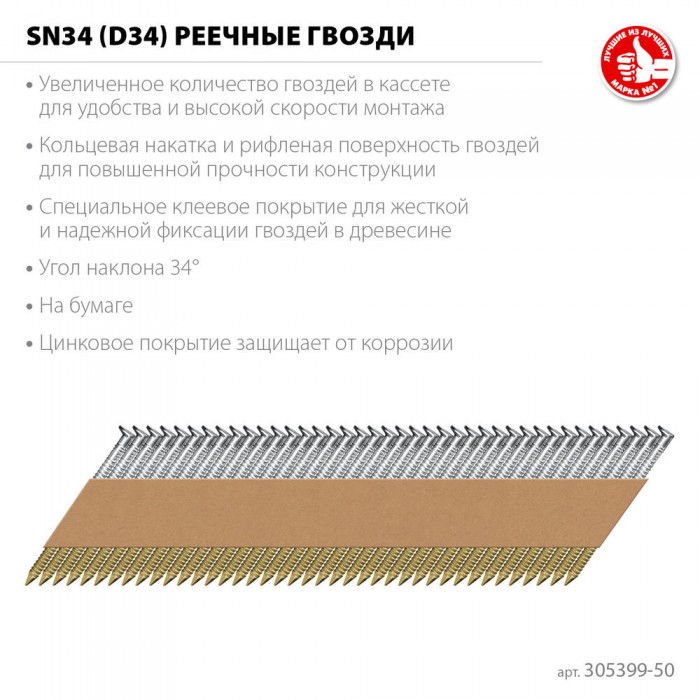 Реечные гвозди соединены в кассету под углом 34° и забиваются при помощи гвоздезабивного пистолета (нейлера). Рифленая поверхность гвоздей оптимально подходит для монтажа деревянных конструкций. Использование нейлера обеспечивает высокую скорость монтажа и удобство в работе.