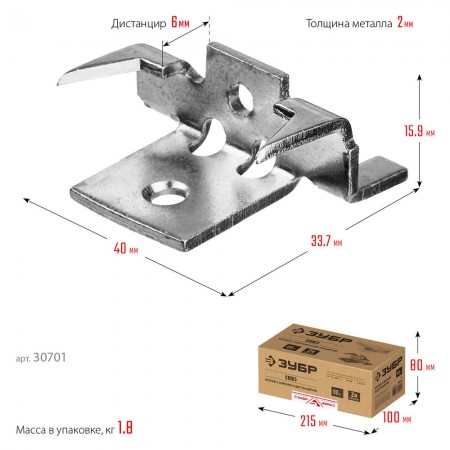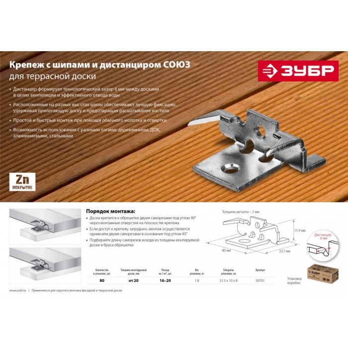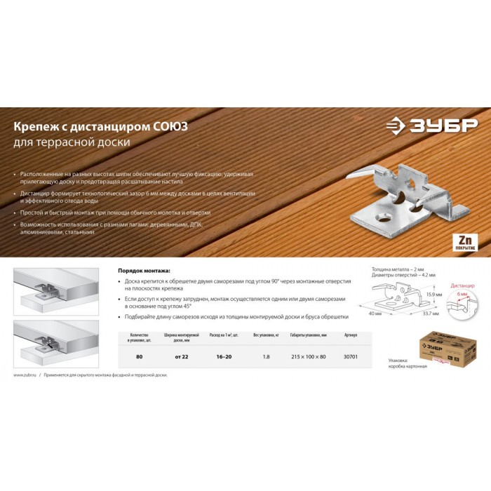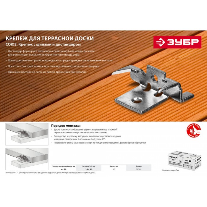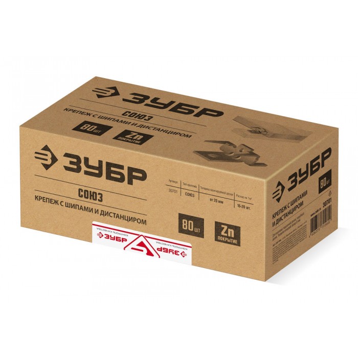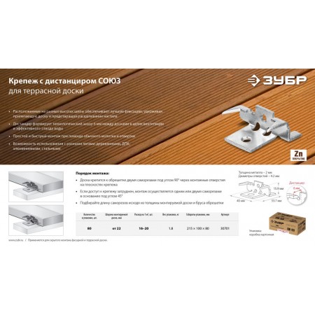 Крепёж с шипами и дистанциором для террасной доски, цинк, 80 шт Союз ЗУБР 30701