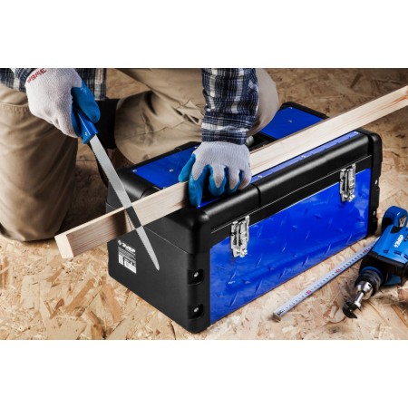 Прочный металлический ящик позволяет организвовать удобное и надежное хранение большого количества инструментов. Широкая алюминиевая рукоятка помогает сместить центр тяжести ящика если это необходимо