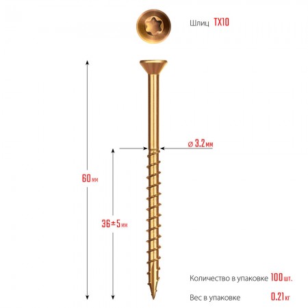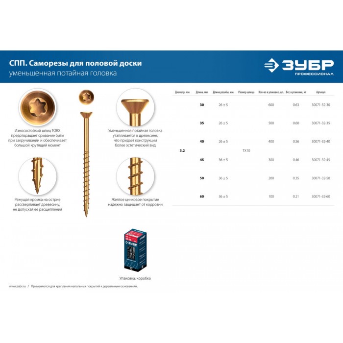 Саморез для половой доски и паркета 60 х 3.2 мм, TX10, цинк, 100 шт Профессионал СПП ЗУБР 30071-32-60