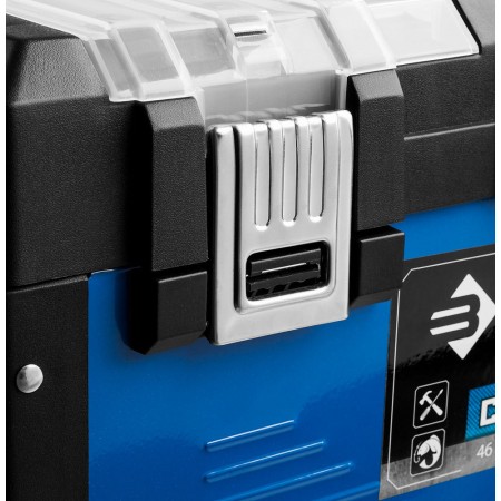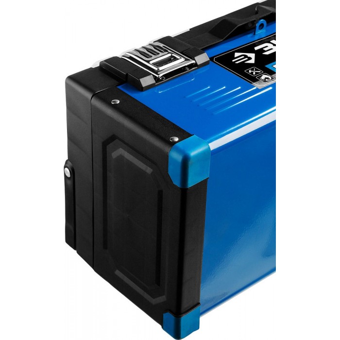 Прочный металлический ящик позволяет организовать удобное и надежное хранение большого количества инструментов. Широкая алюминиевая рукоятка помогает сместить центр тяжести ящика, если это необходимо