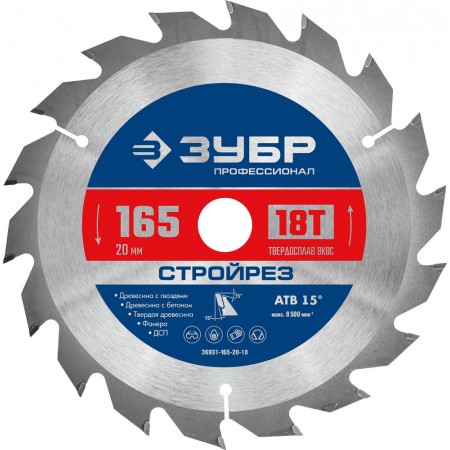 Диск пильный по строительной древесине 165 х 20 мм, 18Т Профессионал Стройрез ЗУБР 36931-165-20-18