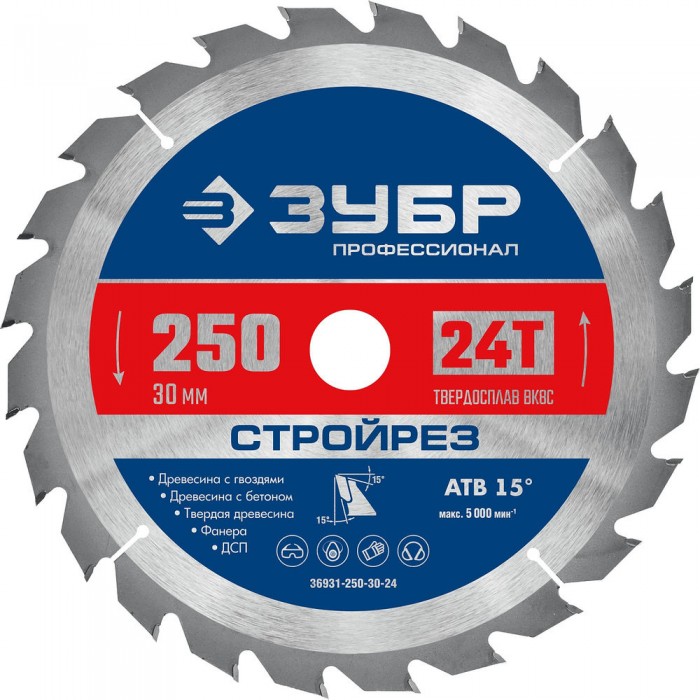 Диск пильный по строительной древесине 250 х 30 мм, 24Т Профессионал Стройрез ЗУБР 36931-250-30-24