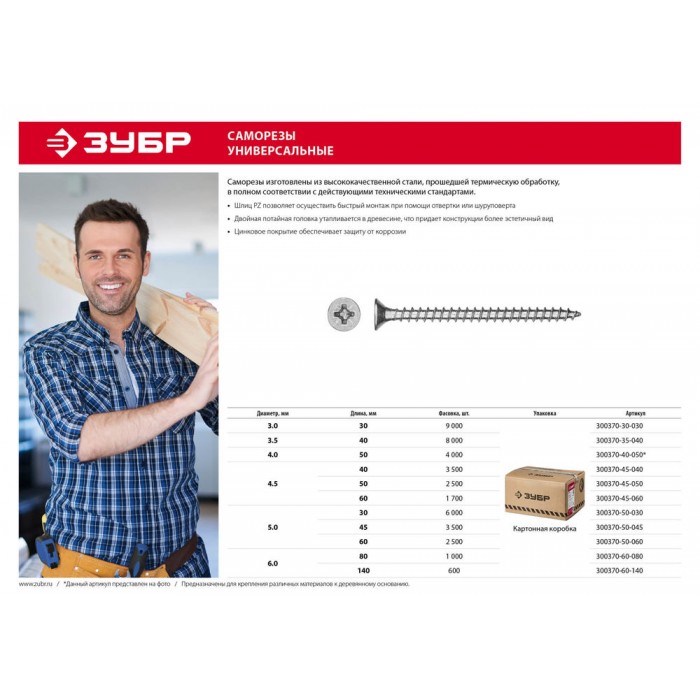 Саморезы универсальные изготовлены из стального прутка с высоким содержанием углерода. Контроль за геометрией самореза начинается с калибровки прутка и заканчивается тщательной проверкой размеров готового изделия. Нормативная твердость стали достигается термической обработкой. Поверхностная твердость 550-800HV, твердость в сердцевине мин. 320HV. Саморезы легко вкручиваются обычным шуруповертом или отверткой. Предварительное сверление в скрепляемых материалах не требуется.