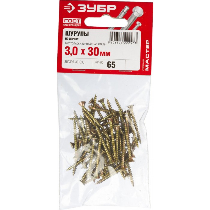 Саморез универсальный 30 х 3.0 мм, жёлтый цинк, 65 шт СУ-Ж ЗУБР 300396-30-030