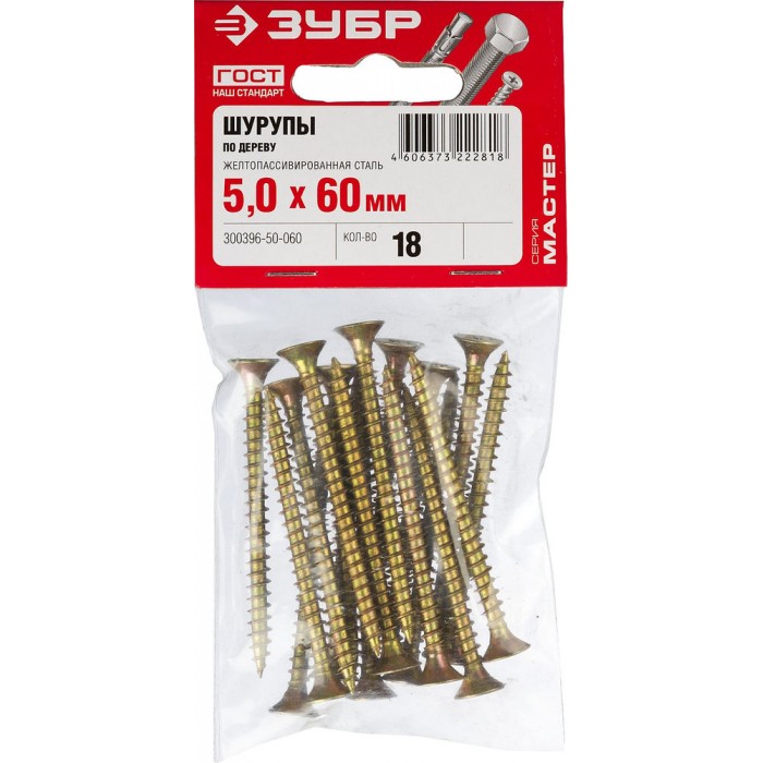 Саморез универсальный 60 х 5.0 мм, жёлтый цинк, 18 шт СУ-Ж ЗУБР 300396-50-060