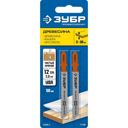 Полотна для лобзика раб. длина 50 мм T119B T-хвост. по дереву фанере и ДСП шаг зуба 2 мм (12TPI) 2 шт У8А сталь Профессионал ЗУБР 15588-2