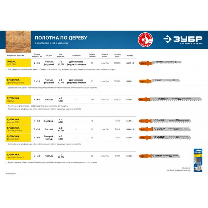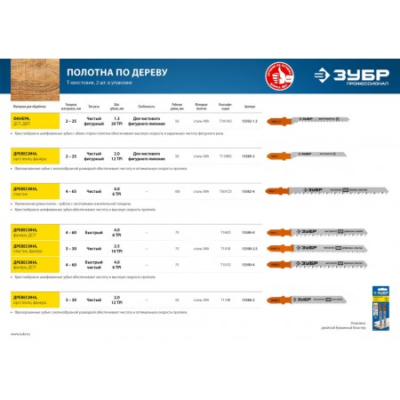 Полотна ЗУБР ″ЭКСПЕРТ″ для электролобзиков имеют увеличенную толщину рабочей части, что даёт повышенную устойчивость к излому и перегибу. Применяются на электрических лобзиках при резке массива древесины, многослойной фанеры и ДСП.