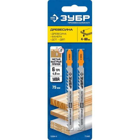 Полотна для лобзика раб. длина 75 мм T144D T-хвост. по дереву шаг зуба 4 мм (6TPI) 2 шт У8А сталь Профессионал ЗУБР 15584-4