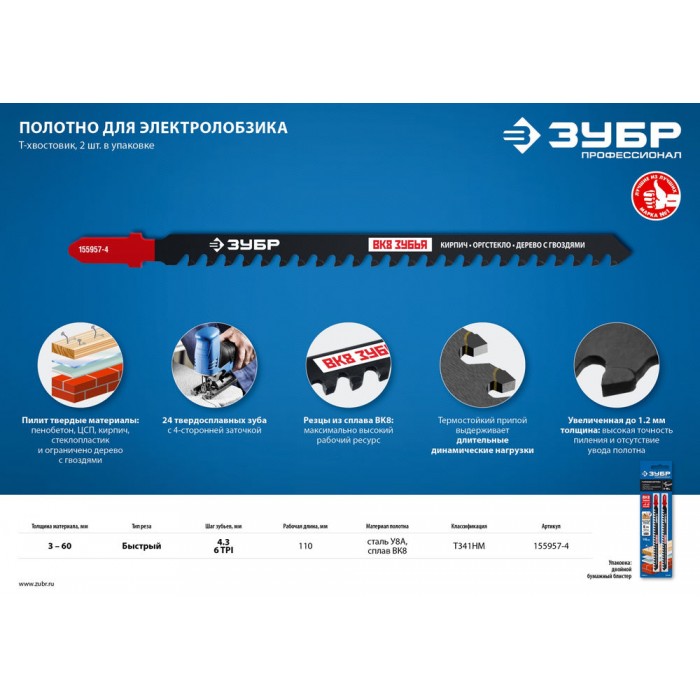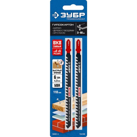 Полотна для лобзика 2 шт T341HM 110 мм / 4.3 мм T-хвост. по пенобетону/дереву/кирпичу твердосплавные зубья ВК-8 ЗУБР 155957-4