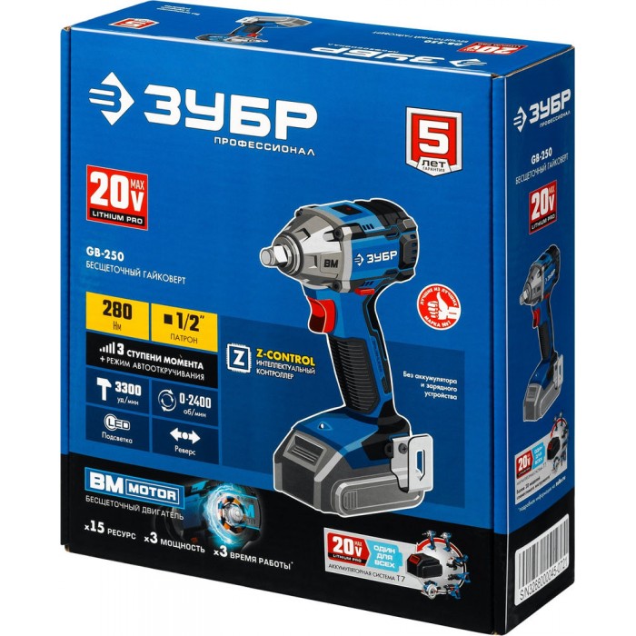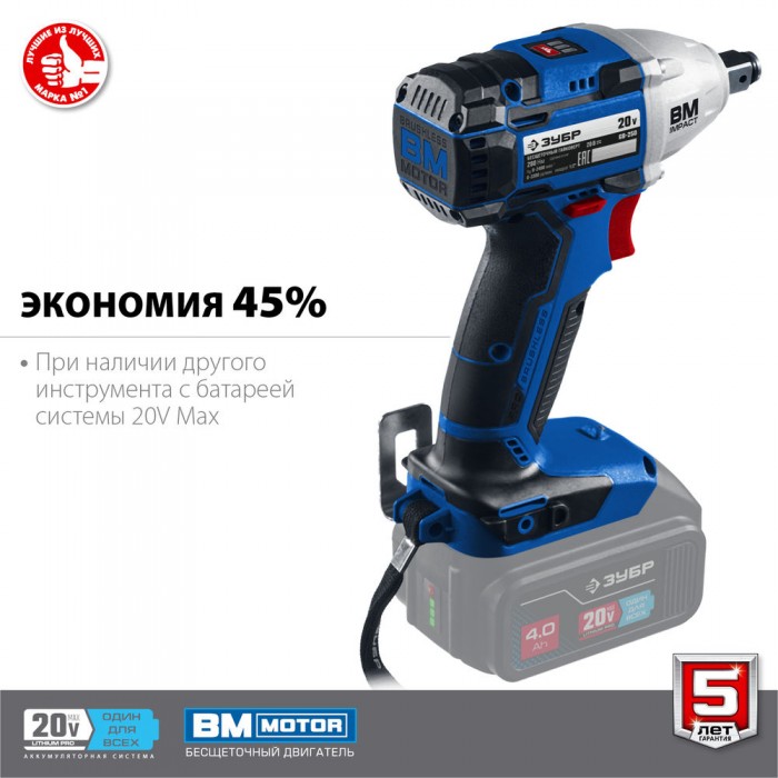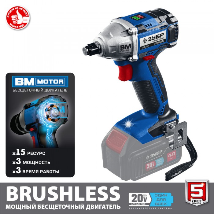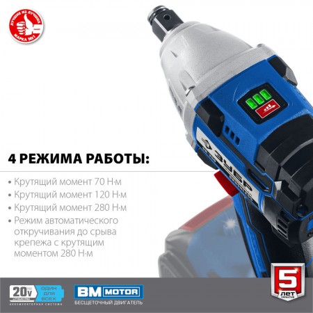 Профессиональное изделие с передовым BRUSHLESS двигателем обеспечивает крутящий момент до 280 Нм и долгий срок службы. Полностью программно-управляемый двигатель способен работать с различными уровнями крутящего момента (для сборки конструкций, закручивания колес, затягиваниякрупного крепежа), реализовывать дополнительные режимы работы и оптимально потреблять заряд при любой нагрузке
