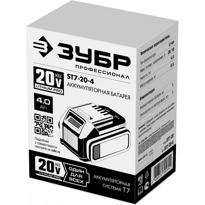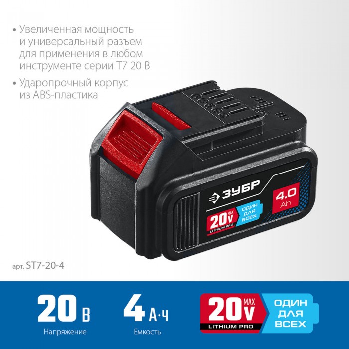 Аккумуляторная батарея 20 В 4.0 А·ч T7 ЗУБР ST7-20-4