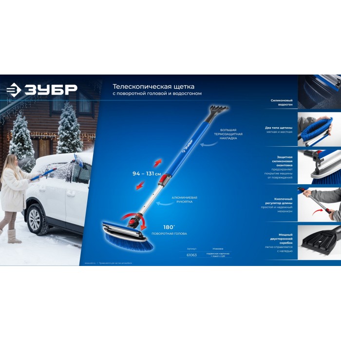 Щетка телескопическая с поворотной головой и водосгоном от снега автомобильная 940-1310 мм ЗУБР Профессионал 61063