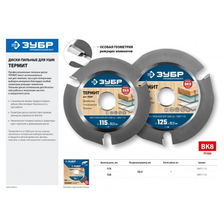 Пильный диск по дереву 115 x 22.2 мм, 3 резца, для УШМ ЗУБР Термит Профессионал 36857-115