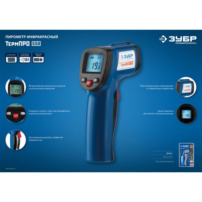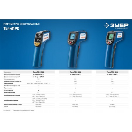 Инфракрасные пирометры ЗУБР обеспечивают бесконтактное измерение температуры с высокой точностью. Большое оптическое разрешение позволяет производить измерения на удалении. Корпус пистолетной формы с удобным курком и наведением точечного целеуказателя на объект.