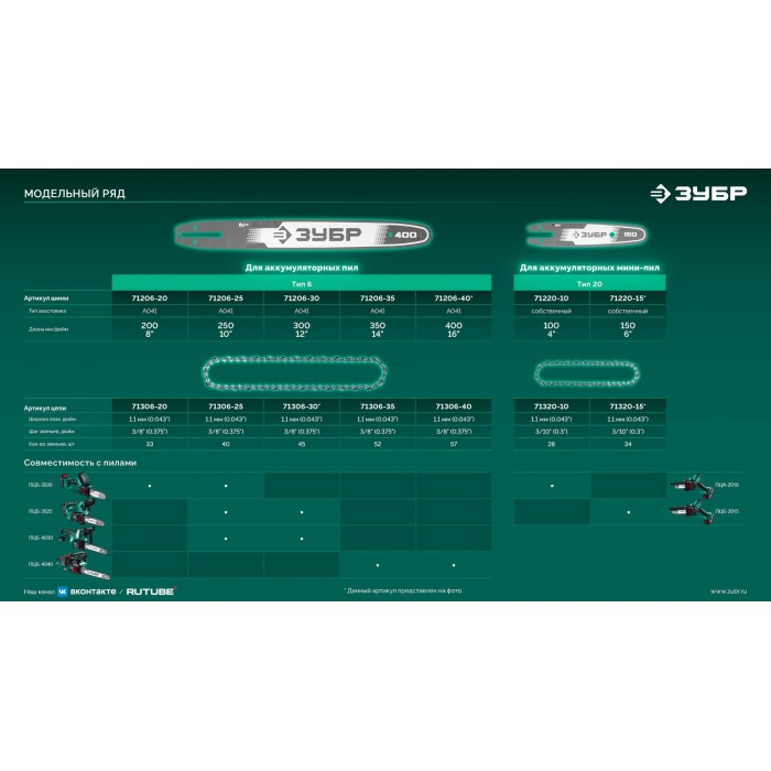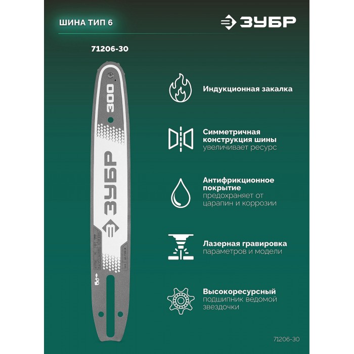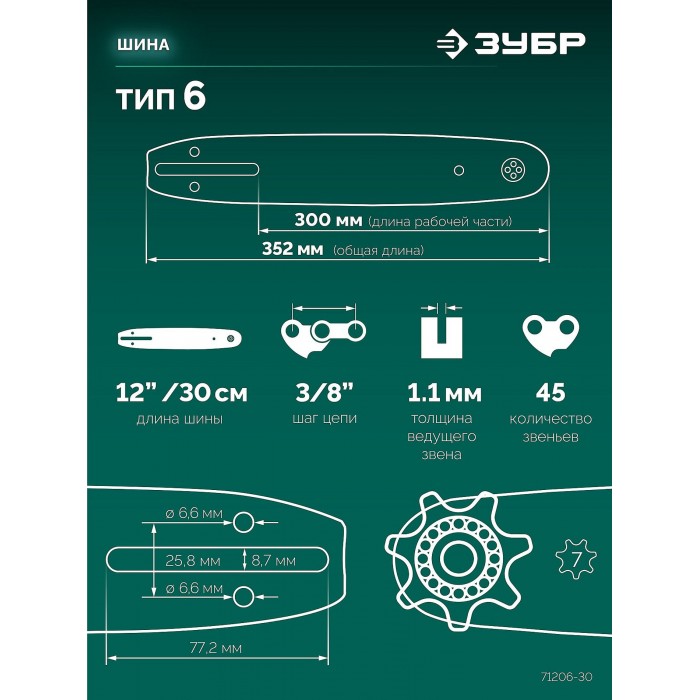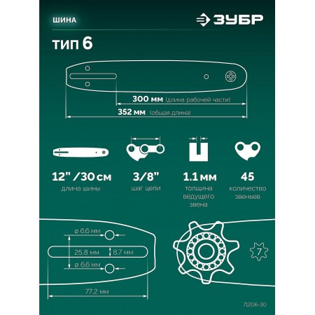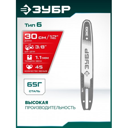 ЗУБР тип 6, 30 см, шаг 3/8?, паз 1.1 мм, 45 звеньев, шина (71206-30)
