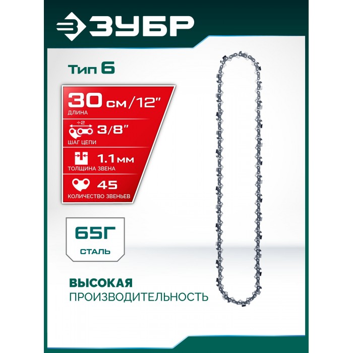 ЗУБР тип 6, 30 см, шаг 3/8?, паз 1.1 мм, 45 звеньев, цепь (71306-30)