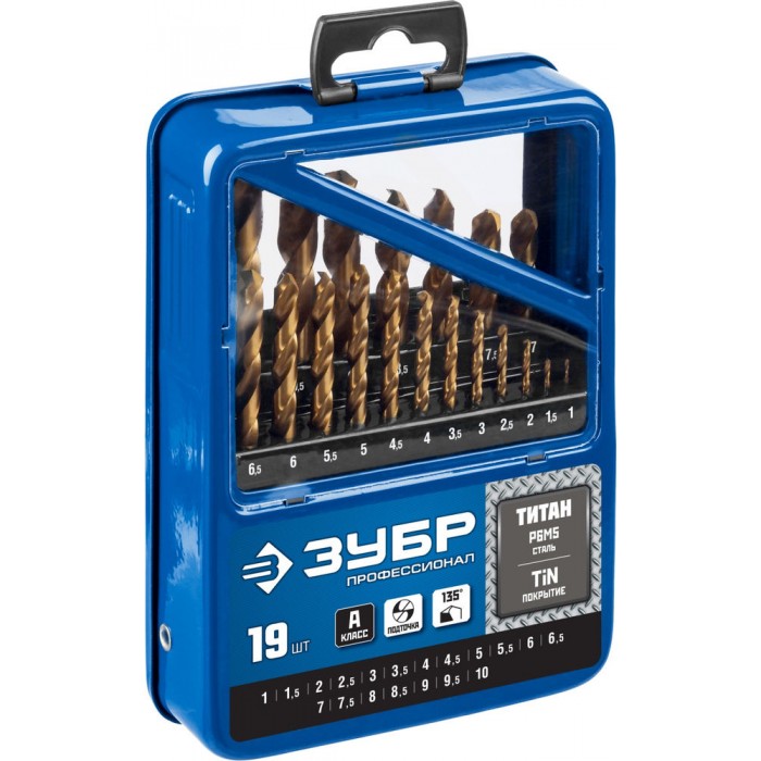 Набор сверл по металлу 19 шт (1-10 мм), сталь Р6М5, класс А, титановое покрытие ЗУБР ТИТАН Профессионал 29617-H19_z01