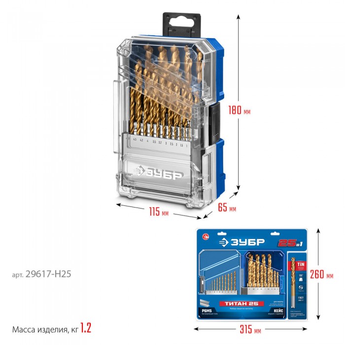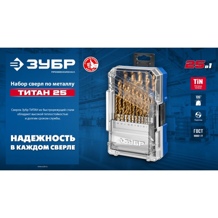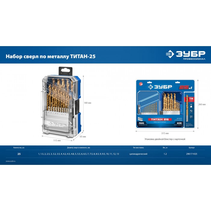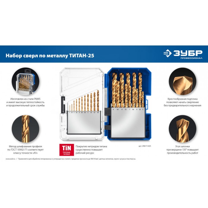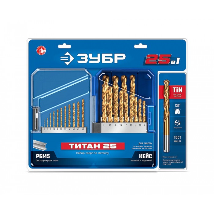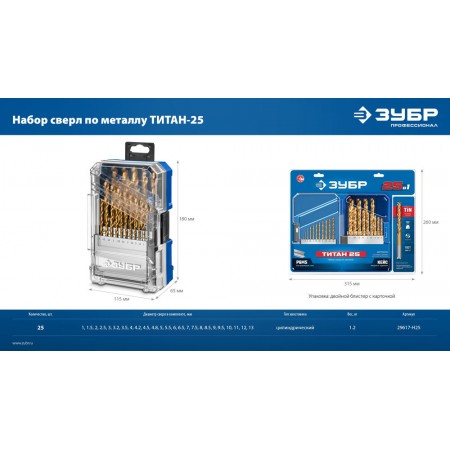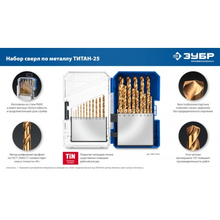 Набор сверл по металлу 25 шт (1-13 мм), сталь Р6М5, класс А, титановое покрытие, пласт.бокс ЗУБР ТИТАН 29617-H25